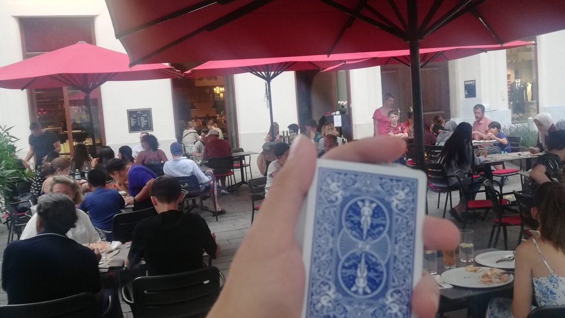 Znalezienie miejsca do występu było jednak nieco trudniejsze. Wielu muzyków w restauracjach nie ułatwiało mi sprawy. W końcu udało mi się zrobić magię z bliska w L’Osteria Wien Bräunerstraße. Świetne miejsce! Ludzie wydawali się całkiem kontaktowi.